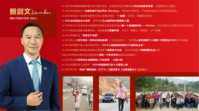 2021年,鲍剑文先生带领团队重磅推出“想象力智能中高考”,秉持“科技赋能教育”理念,打造了教育行业首创的智能导学系统,以科技力量助力学子提升备考效率、实现精准高效学习。鲍剑文先生深耕教育、持续创新的创业故事,更被央视纪录片《点亮想象力》进行专题报道。